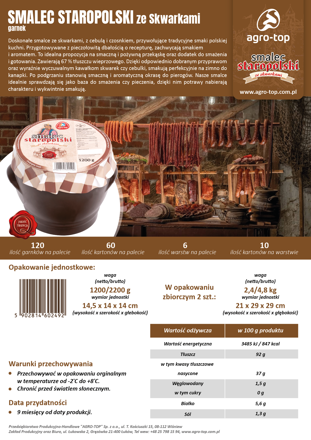Smalec Staropolski ze skwarkami Agro-Top to powrót do prawdziwego, domowego smaku, prostego, wyrazistego i gotowego do użycia w kuchni domowej i profesjonalnej. W efektownym garnku 1200 g zamknęliśmy dokładnie to, co od lat wyróżnia nasz produkt: 67% tłuszczu wieprzowego, złociste skwarki, cebulę i delikatnie wyważone przyprawy.