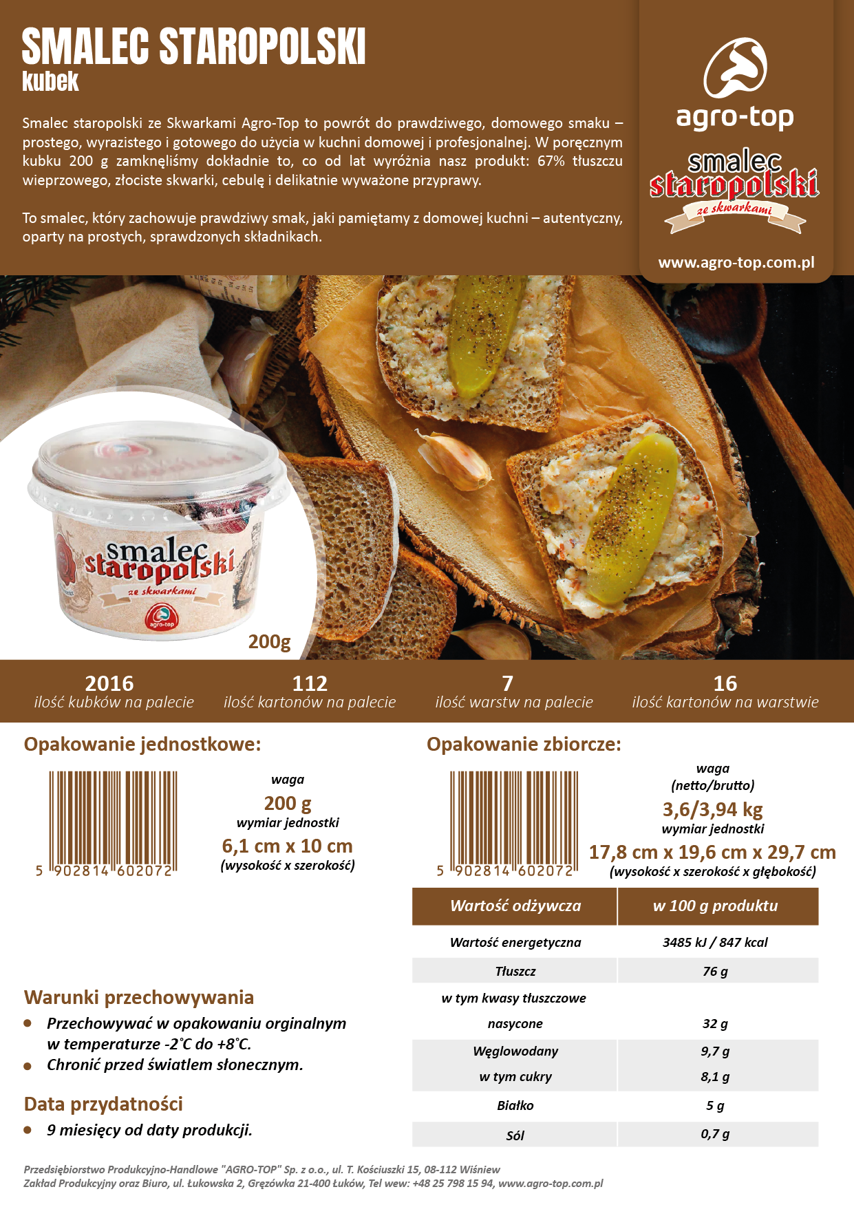 Smalec Staropolski ze Skwarkami Agro-Top to powrót do prawdziwego, domowego smaku – prostego, wyrazistego i gotowego do użycia w kuchni domowej i profesjonalnej. W poręcznym kubku 200 g zamknęliśmy dokładnie to, co od lat wyróżnia nasz produkt: 67% tłuszczu wieprzowego, złociste skwarki, cebulę i delikatnie wyważone przyprawy.