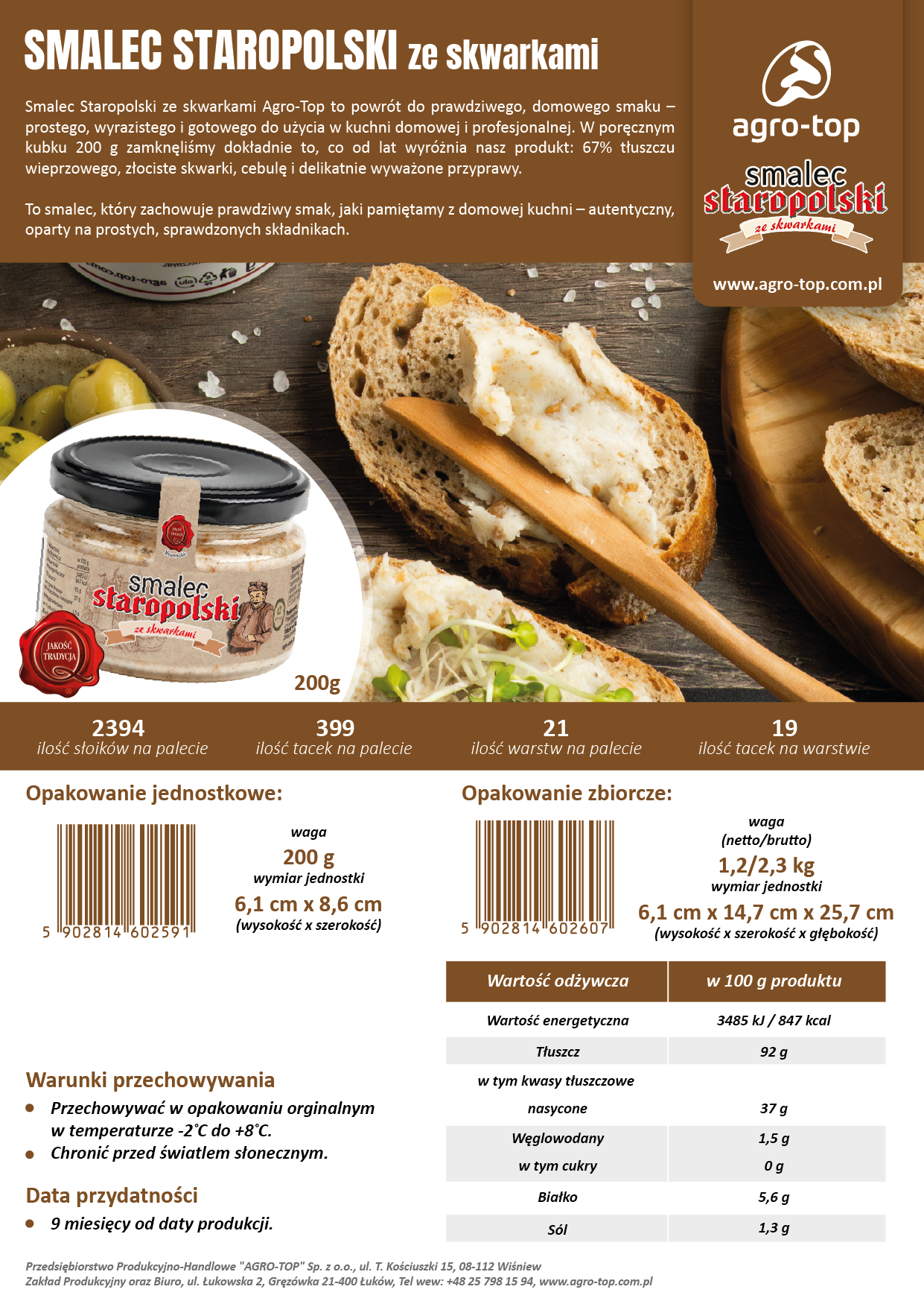 Bazą jest tłuszcz wieprzowy wysokiej jakości, wytapiany tradycyjną metodą. Do tego dodajemy chrupiące skwarki, złocistą cebulę i czosnek, a całość doprawiamy pieprzem i majerankiem. Bez konserwantów, zagęstników ani sztucznych barwników.