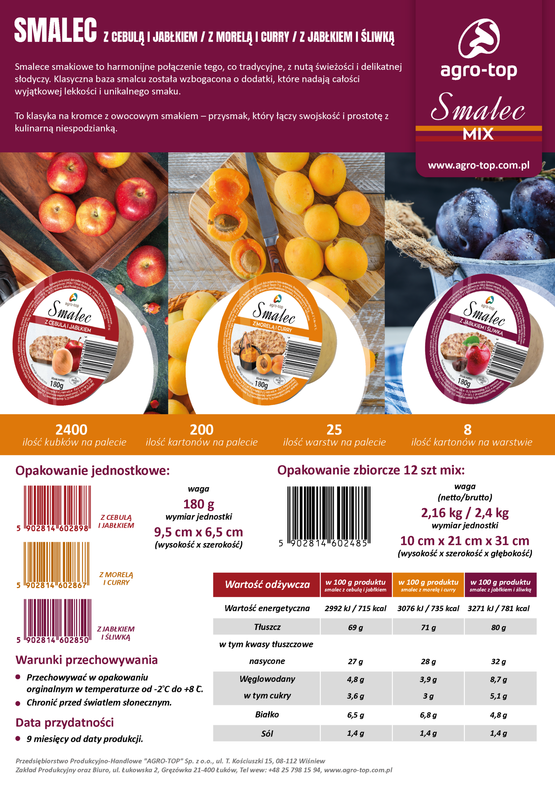 Nasze smalce powstają z najwyższej jakości tłuszczu wieprzowego, w kontrolowanych warunkach i według sprawdzonych receptur. Dbamy o powtarzalność, świeżość i zgodność z aktualnymi standardami żywieniowymi. Dzięki temu możemy zaoferować produkty nie tylko pyszne, ale i godne zaufania. Smalec z cebulą i jabłkiem to kolejny krok w stronę nowych smaków – bez kompromisów w kwestii jakości.