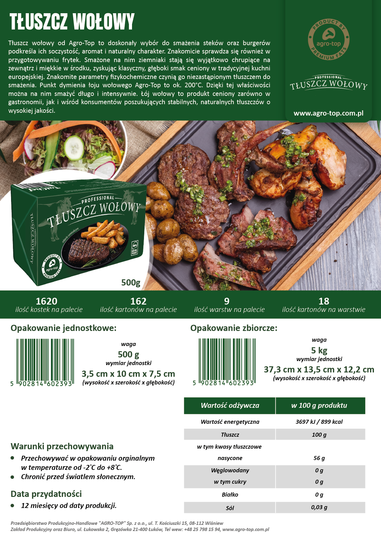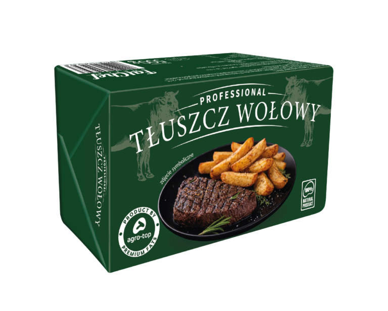 Kostka 500gDoskonałej jakości tłuszcz spożywczy pochodzenia zwierzęcego, otrzymany przez tradycyjne wytopienie z tkanki tłuszczowej bydła. Wysoki poziom kwasów tłuszczowych nasyconych poprawia stabilność temperatury oraz zmniejsza wrażliwość na utlenianie, dzięki czemu produkt może być używany do smażenia i pieczenia. Nasz tłuszcz charakteryzuje się delikatnym, mlecznym zapachem oraz znakomitymi parametrami fizyko-chemicznymi. Dzięki niepowtarzalnemu smakowi oraz jedwabistej teksturze bardzo często używany jest przez renomowanych szefów kuchni. Belgowie używają produkt dla otrzymania doskonałych frytek, zaś Brytyjczycy dodają do słynnej potrawy „ Fish & Chips”. Produkt rekomendowany jest także jako dodatek do sosów i zup.