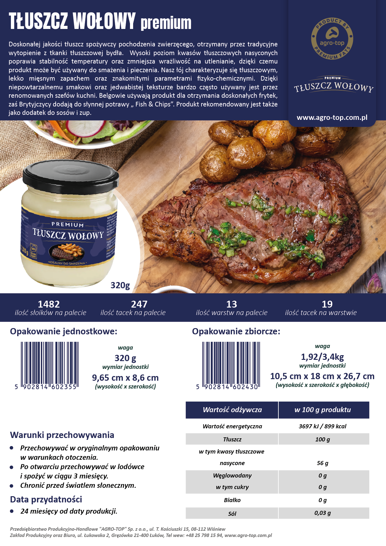 Dostępny w szklanym słoiku 320 g oraz w opakowaniach dla sektora HoReCa, łój wołowy od Agro-Top spełnia oczekiwania najbardziej wymagających odbiorców. To tłuszcz do smażenia, pieczenia i gotowania, który pracuje skutecznie – i za każdym razem daje ten sam, niezawodny rezultat.