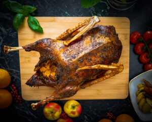 Pieczona gęś owsiana, faszerowana jabłkiem i pomarańczami
